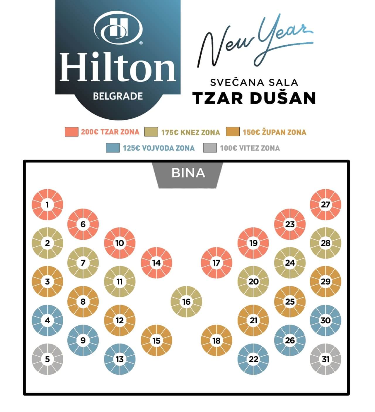 The fabulous banquet hall of the Hilton Belgrade - Tsar Dušan hotel, where the reception will be held, covers an area of 407m2 and will host around 350 guests. With its unique design, elegant interior and luxurious decoration, it captivates and conquers at first sight, which is another of the many reasons that make the Hilton Belgrade hotel the ideal place to celebrate the New Year.