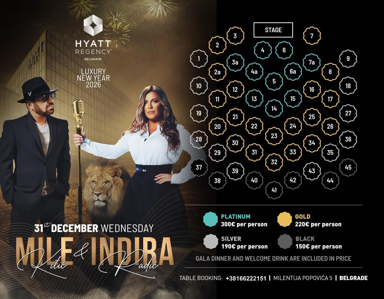 If the fantastically decorated ambience, friendly staff and rich buffet table are not enough to make you decide that craziest night in the year spend right here the musical program will surely prevail, because serbian superstars Mile Kitić and Indira Radić will be in charged during the New Year's Eve in Hotel Hyatt.