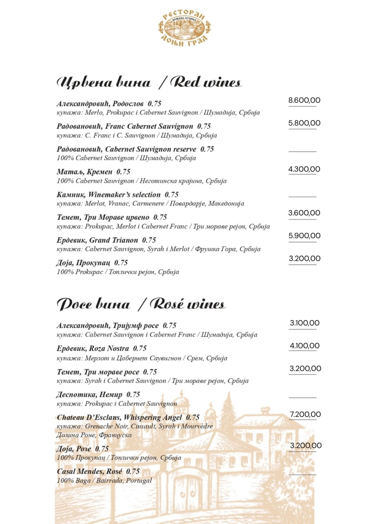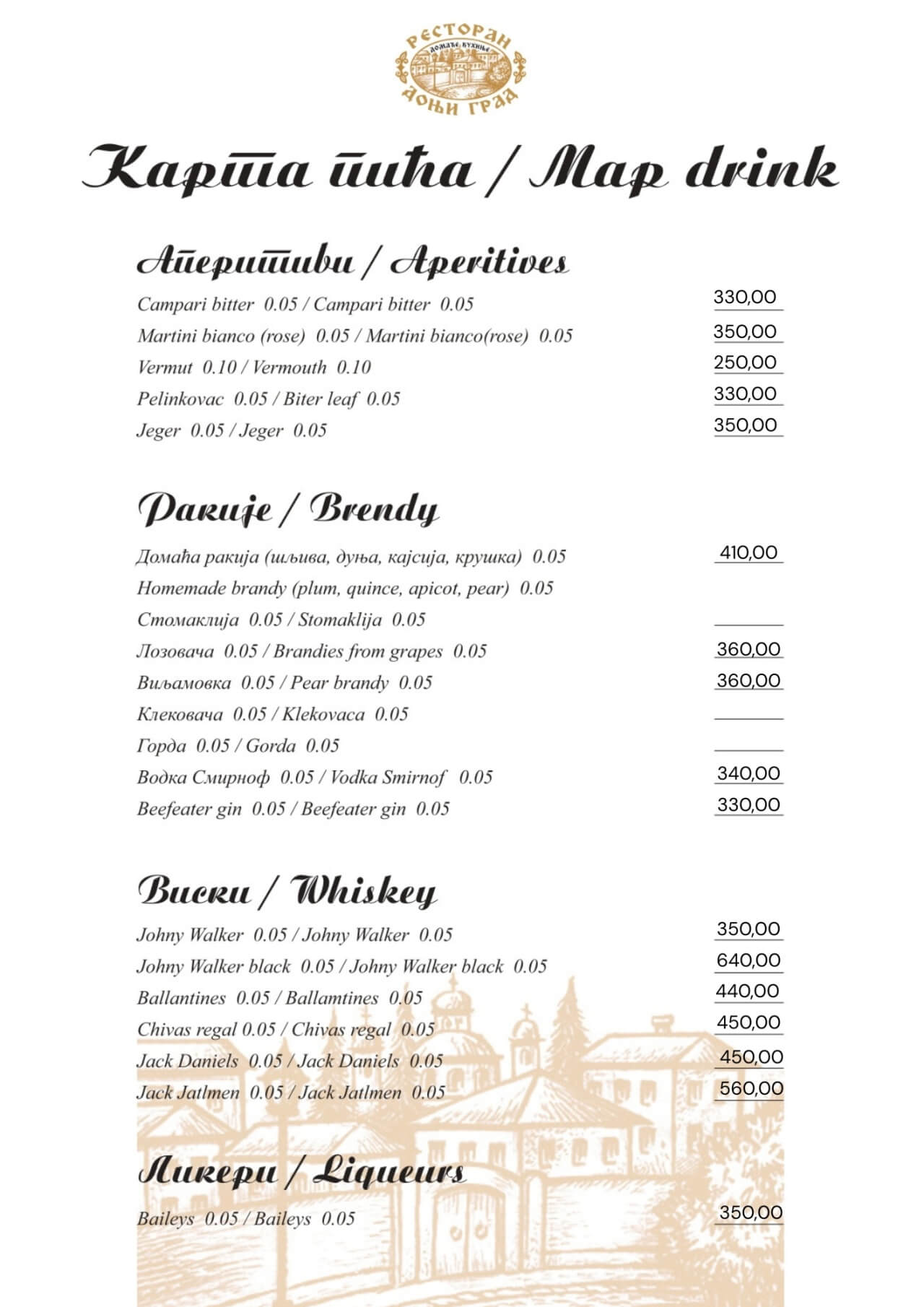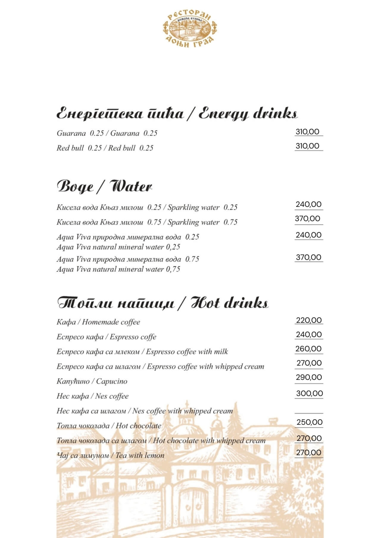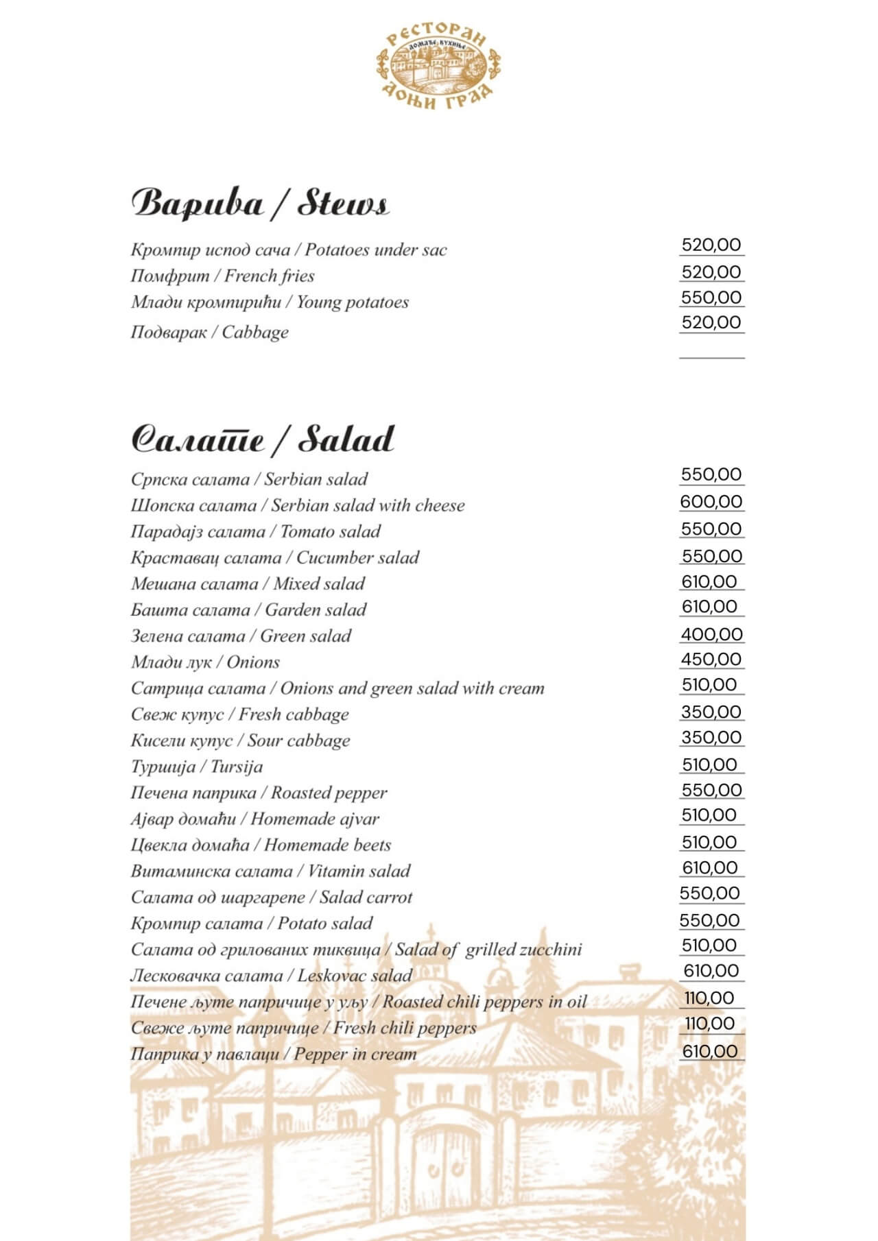 Restoran Donji grad jedno je od onih mesta koja Beograd čine posebnim. Smešten u mirnom delu Dorćola, nedaleko od Kalemegdana, ovaj restoran od 2005. godine spaja duh starog Beograda sa modernim pristupom ugostiteljstvu — stvarajući prostor u kojem se hedonizam i tradicija prirodno prepliću. U Donjem gradu uživaćete u specijalitetima domaće kuhinje pripremljenim po autentičnim receptima: teletini ispod sača, sočnoj jaretini, lozničkoj mućkalici, dimljenoj prasetini, kao i čuvenom bifteku u ulju – jelima zbog kojih se gosti uvek rado vraćaju. Ovde se neguje ukus domaće, tradicionalne kuhinje, ali pripremljen na način koji prati savremene gastronomske standarde.